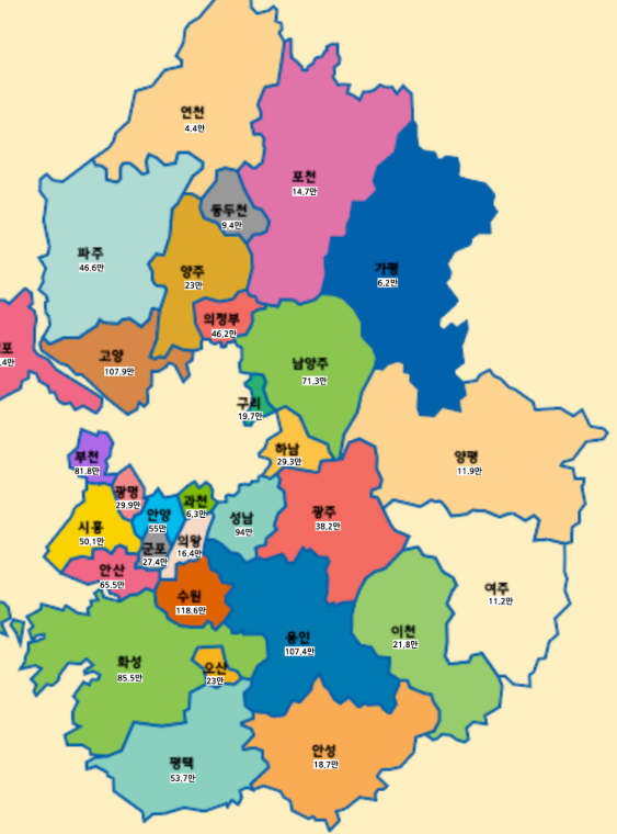 경기도는 국내에서 인구가 가장 많은 광역자치단체입니다. 28개 시, 3개 군, 총 31개 시·군으로 구성되어 있으며, 서울을 중심으로 사방이 넓게 펼쳐져 있어 스마트폰 작은 화면으로는 전체 구조를 파악하기 어렵습니다.